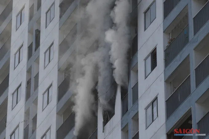Trước đó, khoảng 16 giờ ngày 12-2, đám cháy bùng phát từ căn hộ rộng hơn 50m2 trên tầng 16, cột khói đen phun ra từ ban công, cửa sổ phòng ngủ.