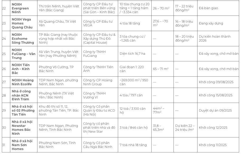 Ở chiều ngược lại, tỉnh Bắc Ninh vẫn đang tăng tốc phát triển nguồn cung nhà ở xã hội. Hiện toàn tỉnh triển khai khoảng 90 dự án với tổng diện tích hơn 311 ha, dự kiến cung ứng trên 127.000 căn hộ khi hoàn thành. Giai đoạn 2022-2025, Bắc Ninh đã đưa vào sử dụng khoảng 25.000 căn nhà ở xã hội. Riêng năm 2026, địa phương đặt mục tiêu hoàn thành thêm 20.000 căn, cao hơn khoảng 2.000 căn so với chỉ tiêu Thủ tướng Chính phủ giao.