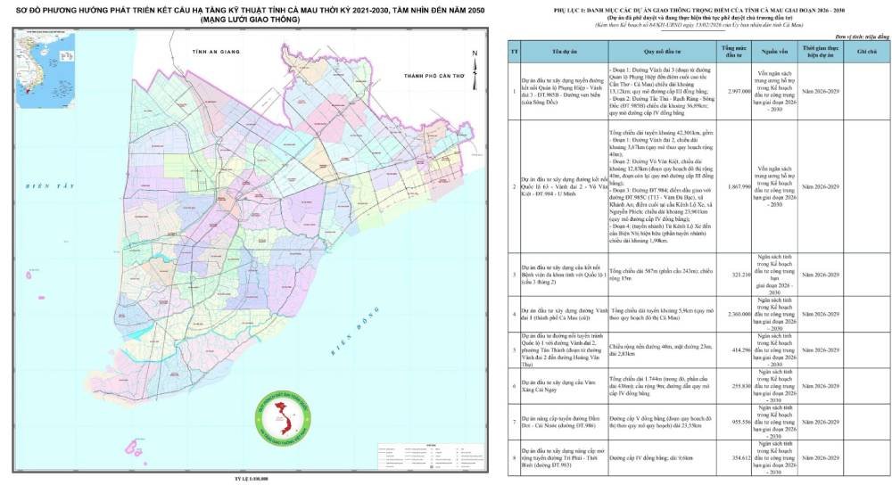 Kế hoạch phát triển hạ tầng giao thông giai đoạn 2026-2030UBND tỉnh Cà Mau vừa ban hành Kế hoạch số 84/KH-UBND về phát triển kết cấu hạ tầng giao thông giai đoạn 2026-2030 trên địa bàn tỉnh.Kế hoạch đặt mục tiêu hình thành bộ khung hạ tầng giao thông đồng bộ, hiện đại, kết nối thông suốt với các tuyến cao tốc,...