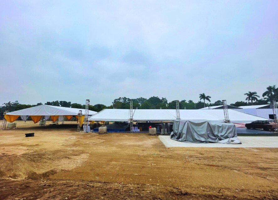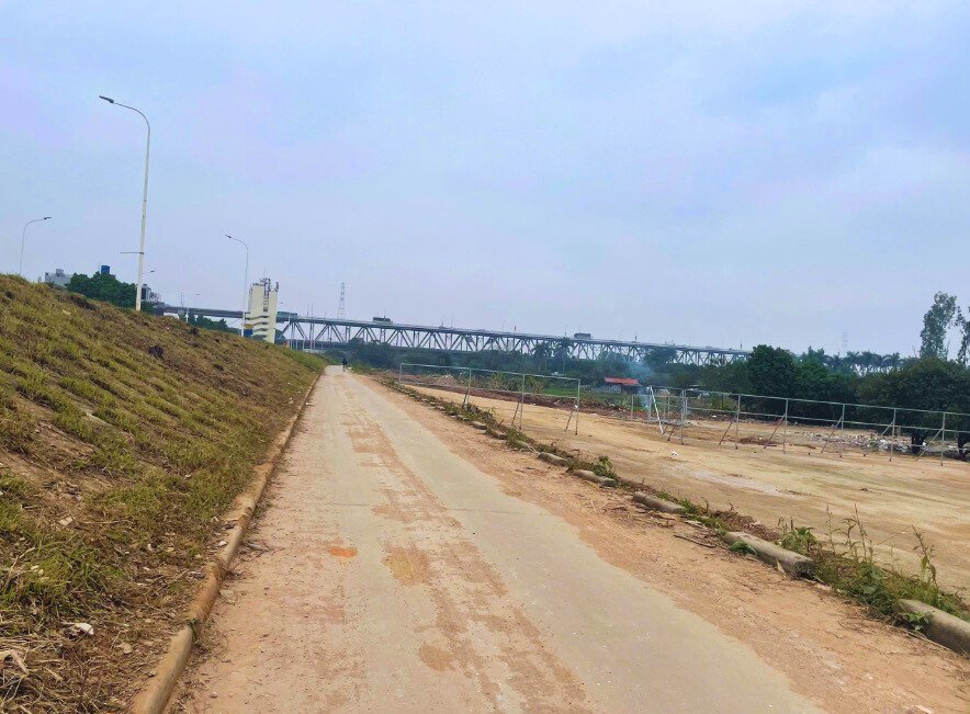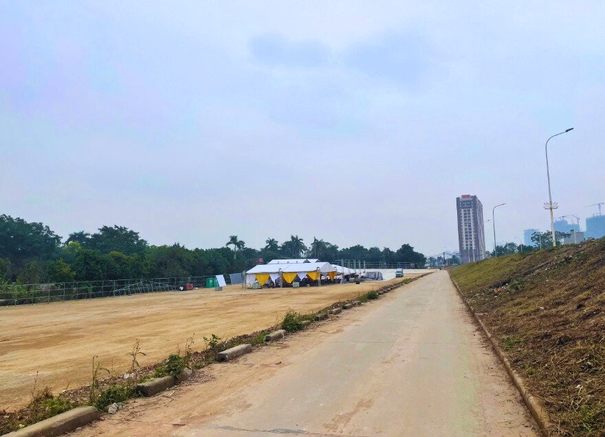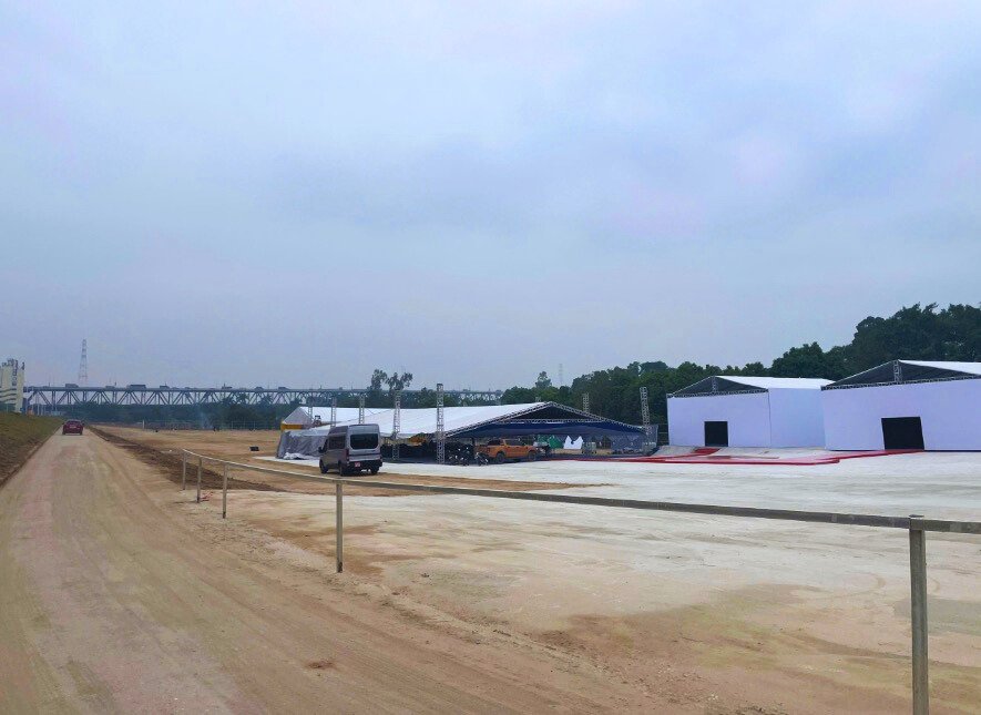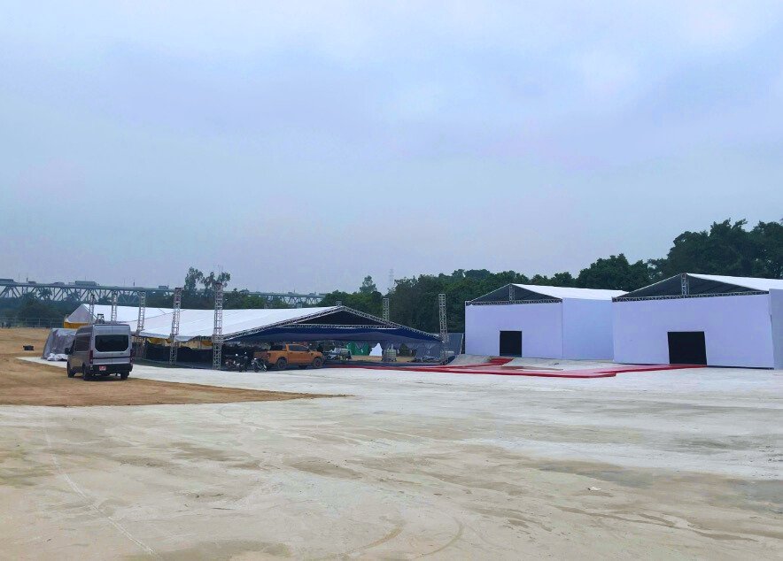 Khu đất nằm gần chân cầu Thăng Long đã bắt đầu dựng sân khấu lớn, cổng chào quy mô và hệ thống hạ tầng tạm phục vụ lễ khởi công dự kiến diễn ra vào ngày 19/12.