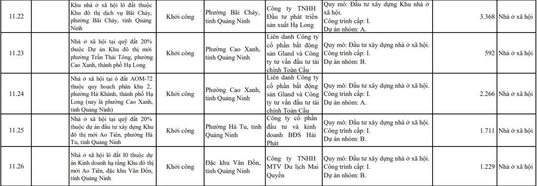 Theo đó, tỉnh Quảng Ninh đã đăng ký khởi công 5 dự án nhà ở xã hội, bao gồm: Khu NOXH lô đất thuộc Khu đô thị dịch vụ Bãi Cháy, phường Bãi Cháy; NOXH tại ô đất AOM-72 thuộc quy hoạch phân khu 2, phường Cao Xanh; NOXH tại quỹ đất 20% thuộc dự án Khu đô thị mới phường Trần Thái Tông, phường Cao Xanh; NOXH tại quỹ đất 20% thuộc dự án Đầu tư xây dựng Khu đô thị mới Ao Tiên, phường Hà Tu; NOXH lô đất I0 thuộc dự án Kinh doanh hạ tầng Khu đô thị mới Ao Tiên, đặc khu Vân Đồn. Tổng mức đầu tư 5 dự án là 9.166 tỷ đồng, cụ thể: