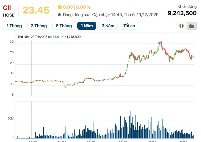 Trên thị trường chứng khoán, cổ phiếu CII ghi nhận các diễn biến tăng giảm đan xen. Kết thúc phiên giao dịch ngày 19/12, thị giá CII đạt 23.450 đồng/cổ phiếu. So với thời điểm đầu năm, mức giá này đã nhân 2, phản ánh kỳ vọng của thị trường vào các dự án hạ tầng mà doanh nghiệp đang triển khai.