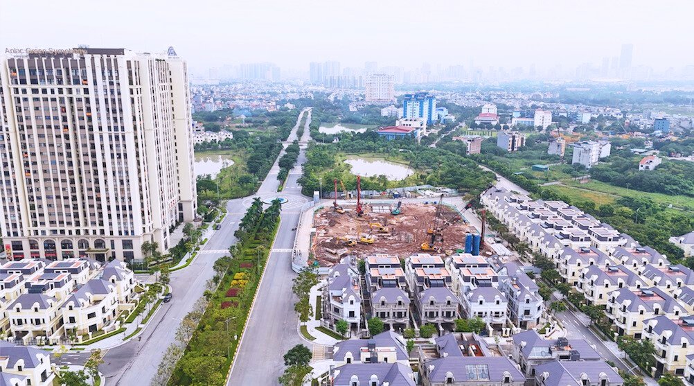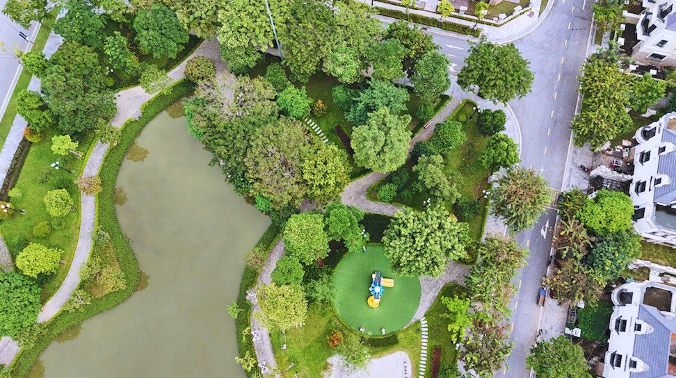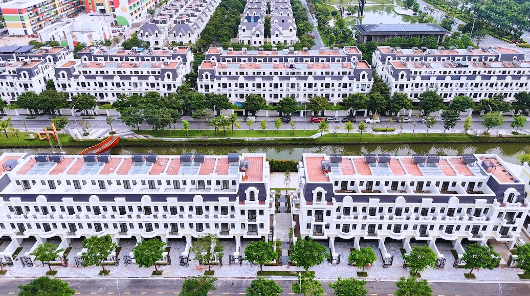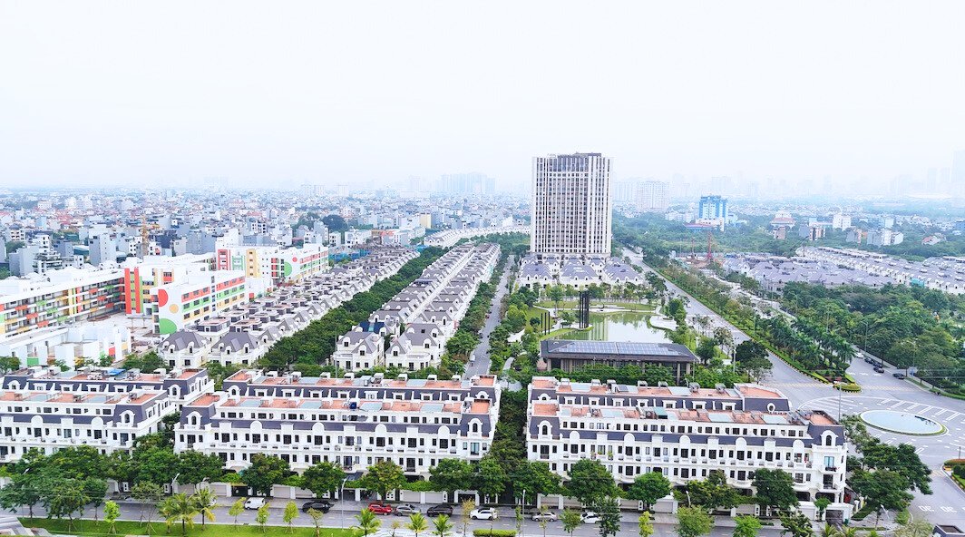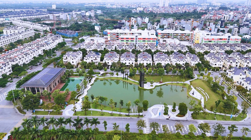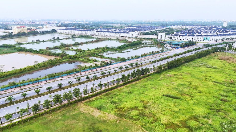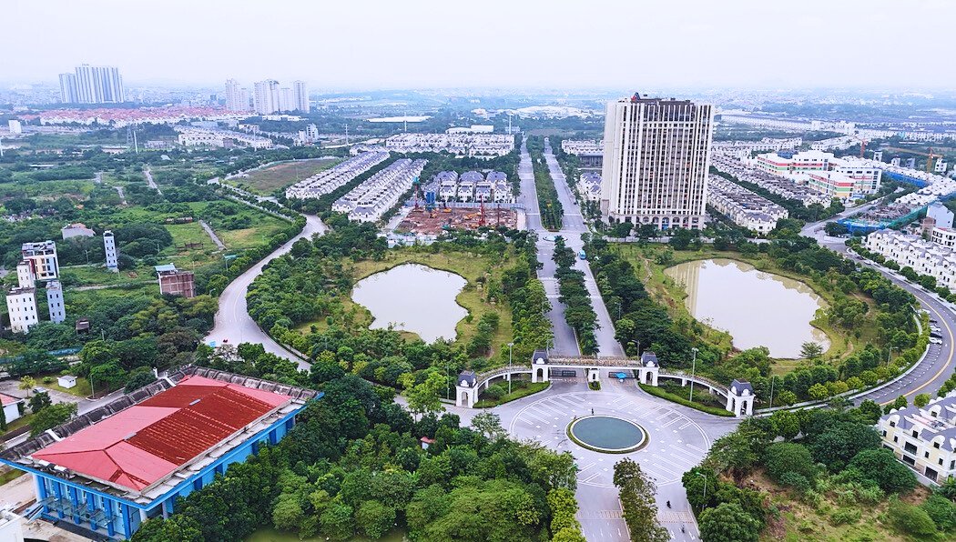 Từ trên cao nhìn xuống, khu đô thị hiện lên với các dãy biệt thự, liền kề quy hoạch bài bản, đường nội khu rộng, nhiều mảng xanh đã thành hình.