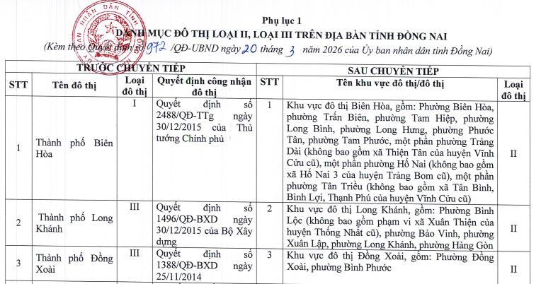 Theo Quyết định 972, tỉnh Đồng Nai hiện có 3 khu vực đô thị loại II: