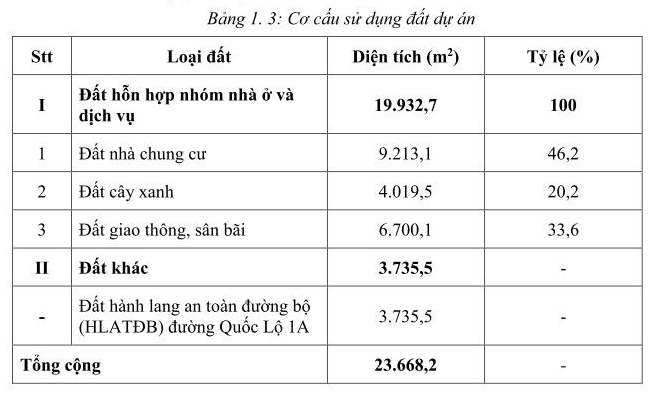 Theo hồ sơ ĐTM, khu đất thực hiện dự án có diện tích 23.668,2 m², nằm tại khu phố Hiệp Thắng, phường Đông Hòa. Đáng chú ý, trong tổng diện tích này có 3.735,5 m² thuộc hành lang an toàn đường bộ Quốc lộ 1A, là phần đất không được phép xây dựng công trình nhà ở theo quy định.