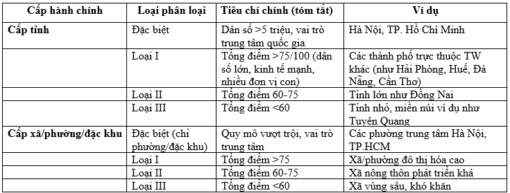 Phân loại ĐVHC cấp tỉnh và cấp xã/phường/đặc khu dựa trên phương pháp tính điểm (tổng tối đa 100 điểm + điểm ưu tiên lên đến 10 điểm).