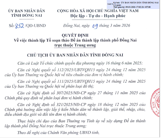 Ngày 9/3, Chủ tịch UBND tỉnh Đồng Nai đã ký quyết định thành lập tổ công tác soạn thảo đề án xây dựng Đồng Nai trở thành thành phố trực thuộc Trung ương. Tổ công tác có nhiệm vụ nghiên cứu, xây dựng hồ sơ và đề xuất lộ trình phát triển để địa phương từng bước đáp ứng các tiêu chí theo quy định đối với đô thị trực thuộc Trung ương.