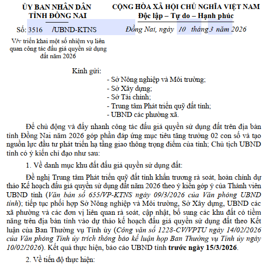 Với việc tăng tốc rà soát quỹ đất, chuẩn bị danh mục đấu giá và đẩy nhanh tiến độ thực hiện trong năm 2026, Đồng Nai đang từng bước khai thác hiệu quả nguồn lực đất đai – một trong những yếu tố quan trọng để thúc đẩy tăng trưởng kinh tế và phát triển đô thị trong giai đoạn tới.