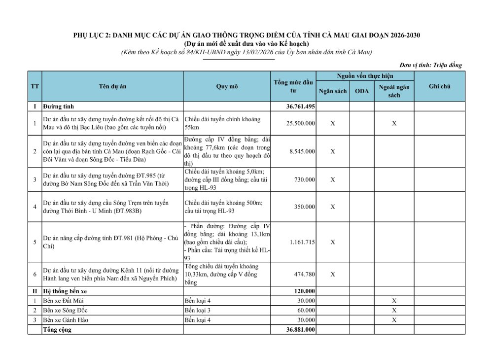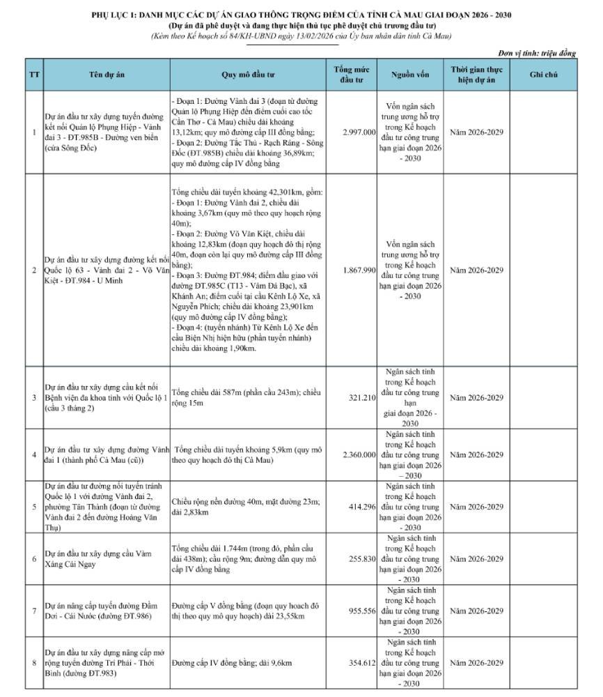 Danh mục các dự án giao thông trọng điểm của tỉnh Cà Mau giai đoạn 2026-2030