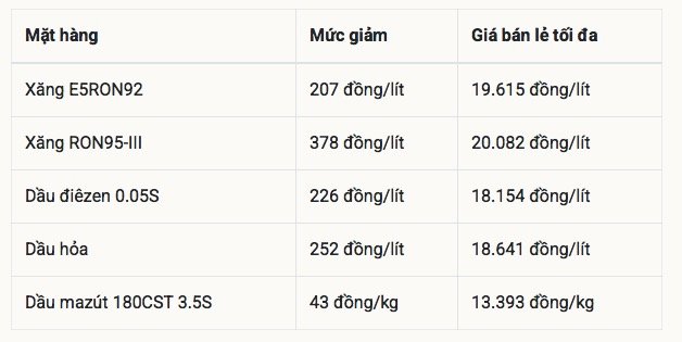 Theo đó, giá các mặt hàng xăng dầu được điều chỉnh giảm cụ thể như sau: