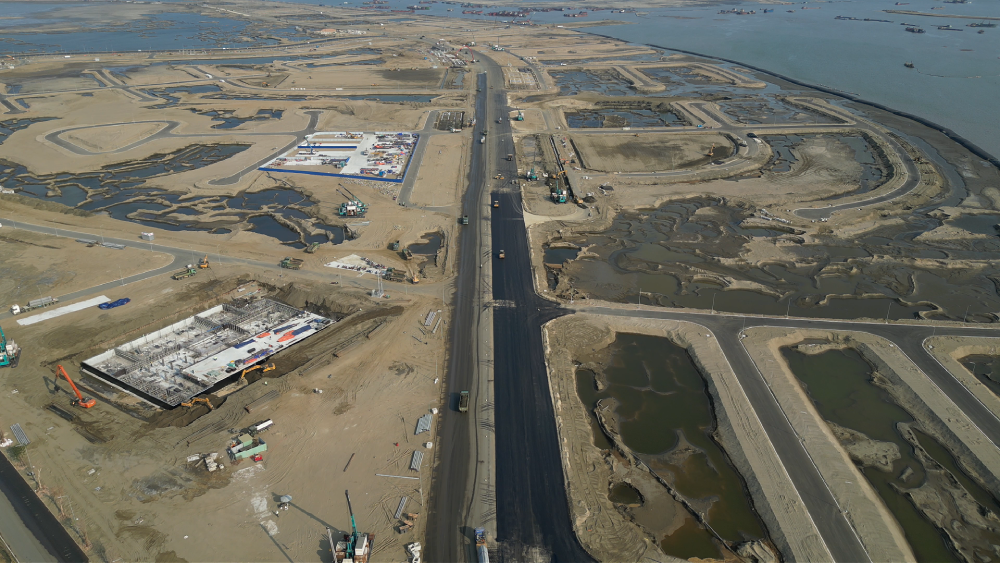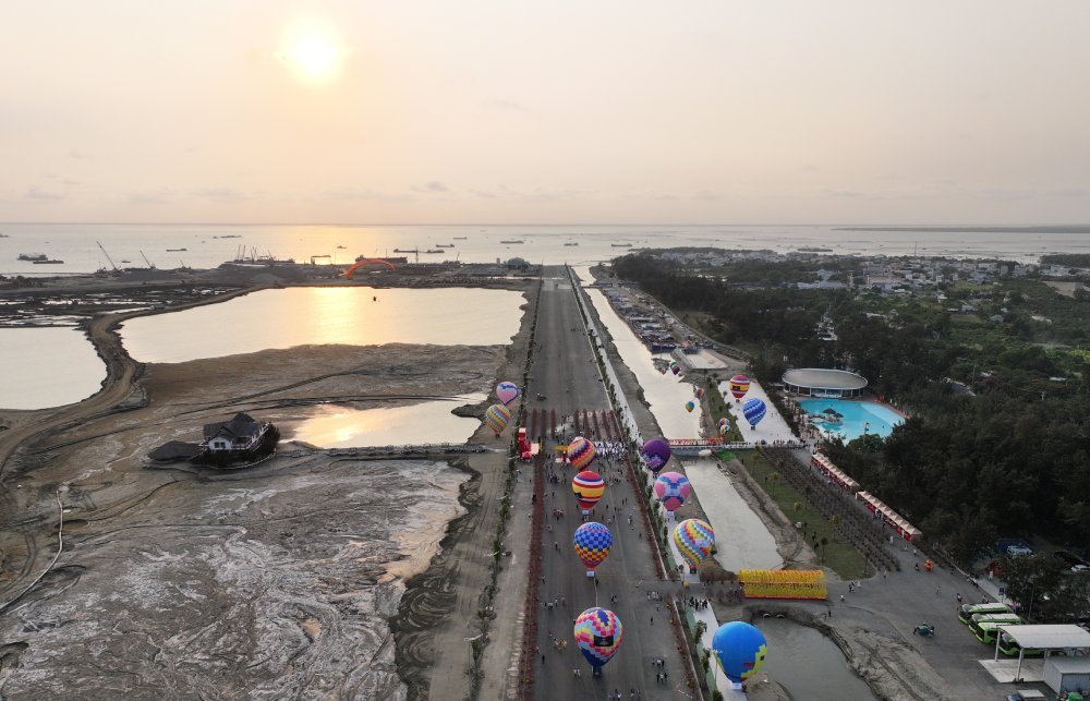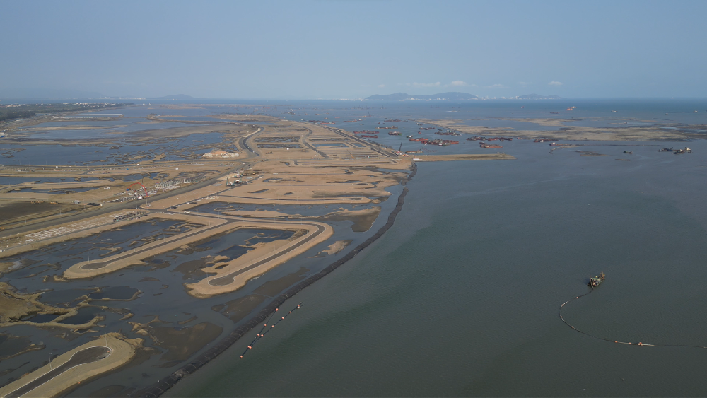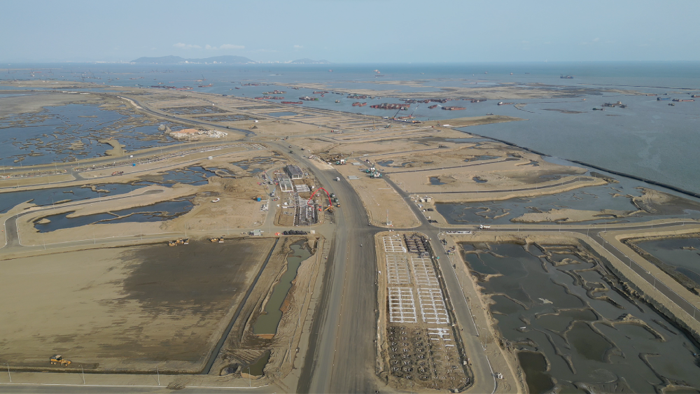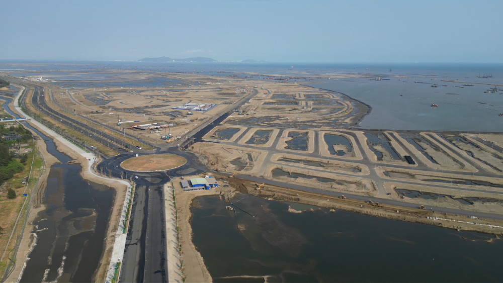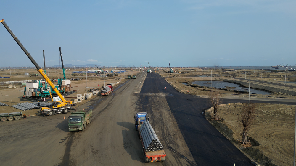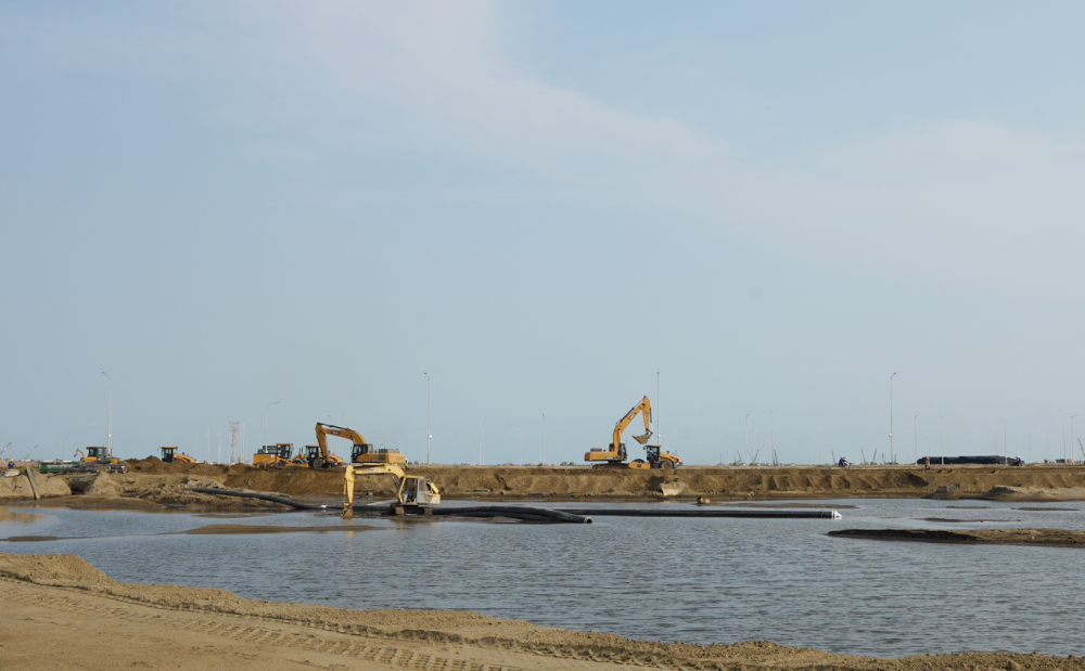 Nhiều thiết bị cơ giới, trạm trung chuyển vật liệu và đội tàu thi công đang vận hành ngày đêm. Các tuyến đường phục vụ công trường đã được mở rộng, đảm bảo hoạt động vận chuyển cát san lấp diễn ra liên tục trên biển.