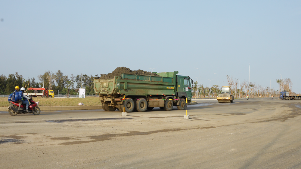 Bên trong công trường, xe tải và máy móc nối đuôi hoạt động liên tục. Nhịp độ thi công khẩn trương, từng đoạn tuyến được san lấp và trải nhựa.