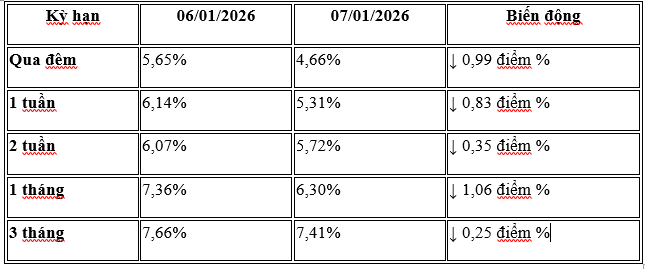 Ở nhóm kỳ hạn ngắn, mặt bằng lãi suất đã hạ nhiệt rõ rệt so với ngày 6/1.