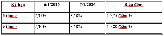 Nếu như ngày 6/1, lãi suất cao nhất mới chỉ quanh 7,6–7,7%/năm thì sang ngày 07/01, lãi suất 6 tháng và 9 tháng đã cùng chạm 8,10%/năm.