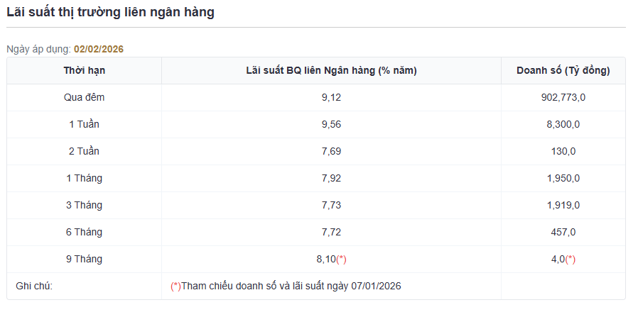 Các kỳ hạn còn lại cũng neo ở mức cao: 2 tuần đạt 7,69%/năm; 1 tháng ở 7,92%/năm; 3 tháng 7,73%/năm; 6 tháng 7,72%/năm và 9 tháng ở mức 8,10%/năm. Mặt bằng lãi suất phổ biến dao động trong vùng 7,7–9,6%/năm, phản ánh chi phí vốn ngắn hạn trong hệ thống ngân hàng tăng mạnh.