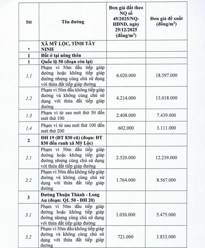 Theo phương án số 2170 ngày 3/4 về bồi thường, hỗ trợ và tái định cư trên địa bàn xã Mỹ Lộc, giá đất được xác định chi tiết theo từng tuyến đường, vị trí tiếp giáp và khoảng cách.