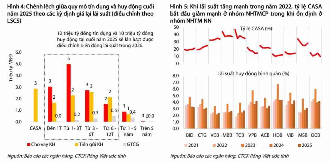 Một điểm sáng đáng chú ý trong năm 2026 là dư địa cải thiện NIM của các ngân hàng. Dư địa mở rộng NIM trong ngắn hạn được thúc đẩy bởi quá trình định giá lại lãi suất của các khoản vay, đặc biệt trong giai đoạn 3 tháng đầu năm 2026 khi quy mô các khoản vay được điều chỉnh lãi suất lên mức cao hơn đáng kể so với quy mô nguồn vốn huy động được điều chỉnh lãi suất trong cùng thời gian.