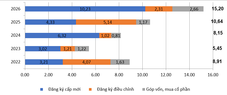 Vốn đầu tư nước ngoài đăng ký vào Việt Nam 3 tháng đầu năm giai đoạn 2022-2026 (Tỷ USD). Nguồn: NSO