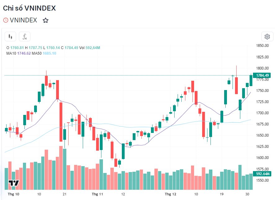 Sau khi tạo đáy vào tháng 4/2025, VN-Index bước vào nhịp tăng mạnh và liên tục chinh phục các cột mốc lịch sử. Chỉ số lần lượt vượt qua các ngưỡng 1.500, 1.600, 1.700 điểm và lần đầu tiên vượt mốc 1.800 điểm trong phiên 25/12, khi đạt đỉnh 1.805,93 điểm. Dù chưa giữ vững được mốc này, xu hướng chung cho thấy thị trường đang mở rộng theo chiều hướng tích cực.