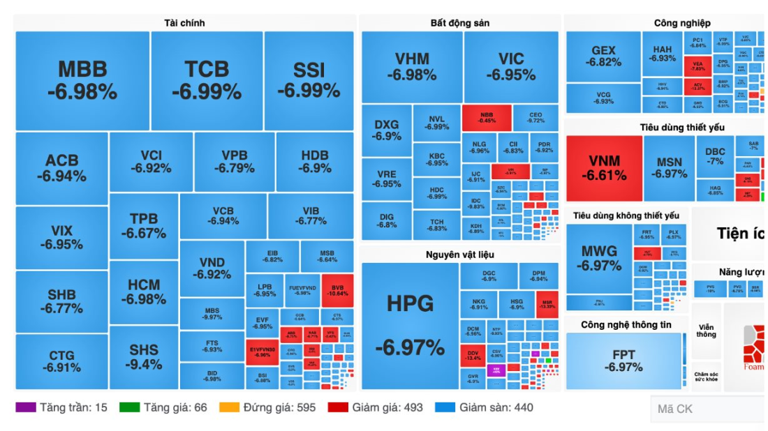 Trước thông tin này, thị trường chứng khoán trở nên hoảng loạn, các nhà đầu tư ồ ạt bán tháo khiến sắc xanh lơ và đỏ bao trùm sàn HOSE, hơn một nửa số cổ phiếu rơi xuống mức giá sàn.