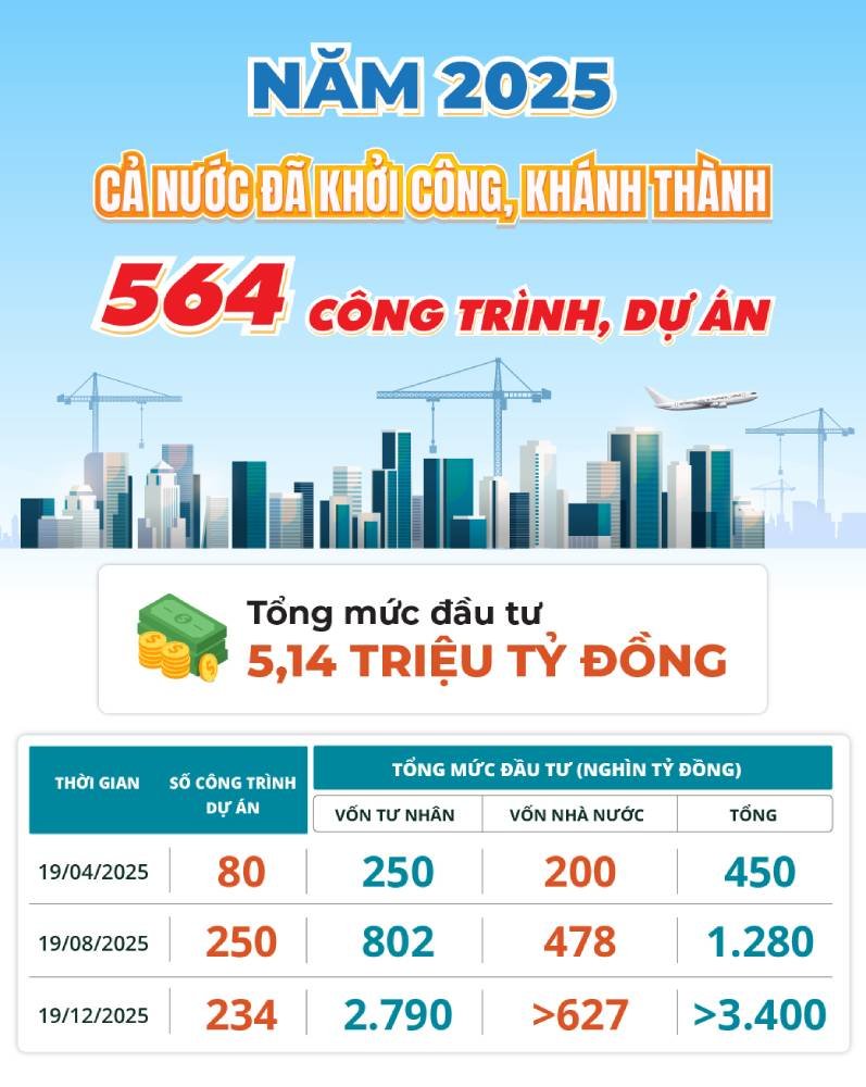 | Năm 2025, Trung ương và địa phương đã khởi công, khánh thành 564 công trình, dự án với tổng mức đầu tư trên 5,14 triệu tỷ đồng, trong đó nguồn vốn tư nhân 3,84 triệu tỷ, chiếm 74,6%, nguồn vốn nhà nước 1,3 triệu tỷ, chiếm 25,4%. |