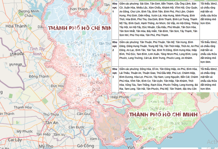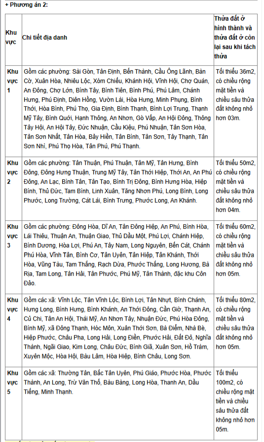 Khu vực 1: Tối thiểu 36m², chiều rộng mặt tiền và chiều sâu thửa đất không nhỏ hơn 3m. Khu vực này bao gồm các phường trung tâm cũ của TP.HCM như Sài Gòn, Tân Định, Bến Thành, Bình Thạnh, Gò Vấp, Phú Nhuận, Tân Bình, Tân Phú… (các khu dân cư mật độ cao, đô thị hiện hữu).