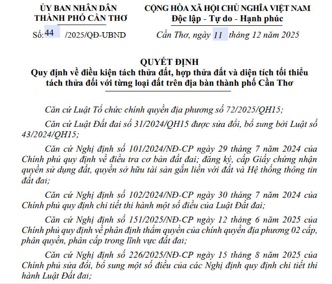 Quyết định có hiệu lực từ ngày 11/12/2025, đồng thời bãi bỏ một số quyết định trước đây liên quan điều kiện tách thửa, hợp thửa trên địa bàn thành phố Cần Thơ, Hậu Giang và Sóc Trăng, nhằm đảm bảo thống nhất quản lý theo Luật Đất đai mới.
