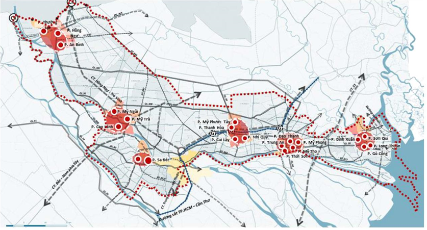 1. Đô thị Mỹ Tho (gồm các phường Mỹ Tho, Đạo Thạnh, Mỹ Phong, Thới Sơn và Trung An) Là đô thị trung tâm của tiểu vùng ĐBSCL; là trung tâm kinh tế, chính trị, văn hóa, khoa học kỹ thuật của tỉnh Đồng Tháp; trung tâm du lịch về văn hóa lịch sử, du lịch sông nước vườn cây ăn trái đặc trưng cấp quốc gia, trung tâm thương mại – dịch vụ; trung tâm văn hóa, giáo dục – đào tạo, nghiên cứu công nghệ sinh học cấp vùng; đô thị phát triển theo hướng tiếp cận với các tiêu chuẩn đô thị xanh, đô thị thông minh; có vai trò quan trọng về an ninh quốc phòng.