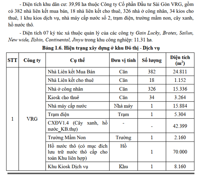 Các hạng mục đã hình thành chủ yếu phục vụ nhu cầu ở và sinh hoạt gắn với khu công nghiệp, bao gồm 382 căn nhà liên kết mua bán, 18 căn nhà cho thuê, 326 căn nhà ở công nhân, 34 kios dịch vụ, cùng các công trình thiết yếu như trường mầm non, trạm điện, nhà máy cấp nước, cây xanh và hồ nước.