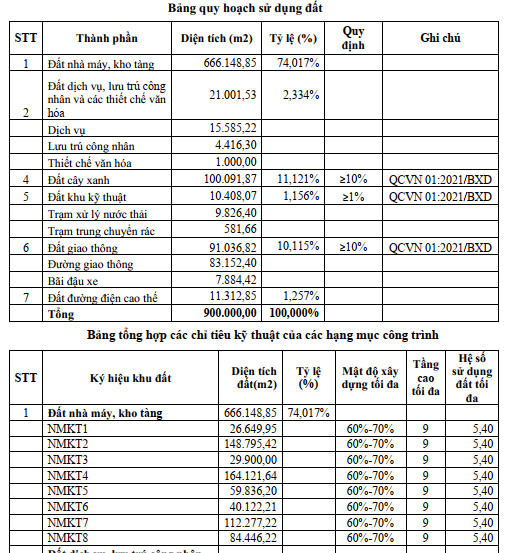 -Đất nhà máy – kho tàng chiếm khoảng 666.149 m² (74% tổng diện tích), mật độ xây dựng thuần tối đa 70% (1-5 tầng) hoặc 60% (6-9 tầng), tầng cao tối đa 9 tầng, hệ số sử dụng đất tối đa 6,4. Ít nhất 3% diện tích đất công nghiệp dành riêng cho doanh nghiệp nhỏ và vừa, công nghiệp hỗ trợ theo Nghị định 35/2022/NĐ-CP.