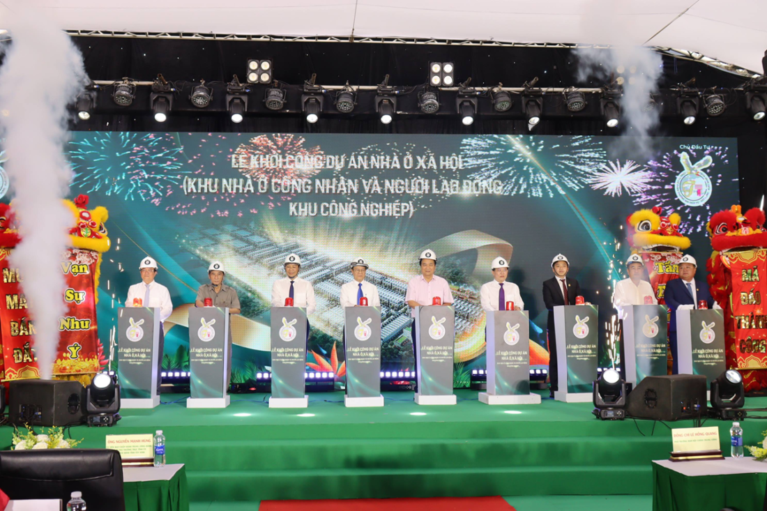 Các đại biểu thực hiện nghi thức khởi công Dự án nhà ở xã hội tại Khu Công nghiệp Cầu Tràm ngày 18/4