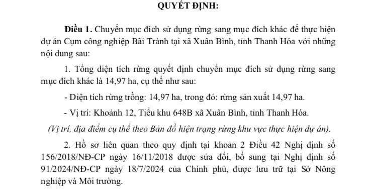 Việc chuyển mục đích sử dụng rừng lần này nhằm phục vụ Cụm công nghiệp Bãi Trành – một dự án đã được thành lập từ năm 2022, với quy mô khoảng 33,66 ha, đặt tại xã Xuân Bình (huyện Như Xuân cũ). Cụm công nghiệp được định hướng trở thành điểm đến của nhiều ngành nghề sản xuất đa dạng như may mặc, tiểu thủ công nghiệp, sản xuất vật liệu xây dựng, nội thất, cơ khí, điện – điện tử, chế biến thực phẩm, dược liệu, lâm sản, nhựa, cũng như chế biến thức ăn chăn nuôi.