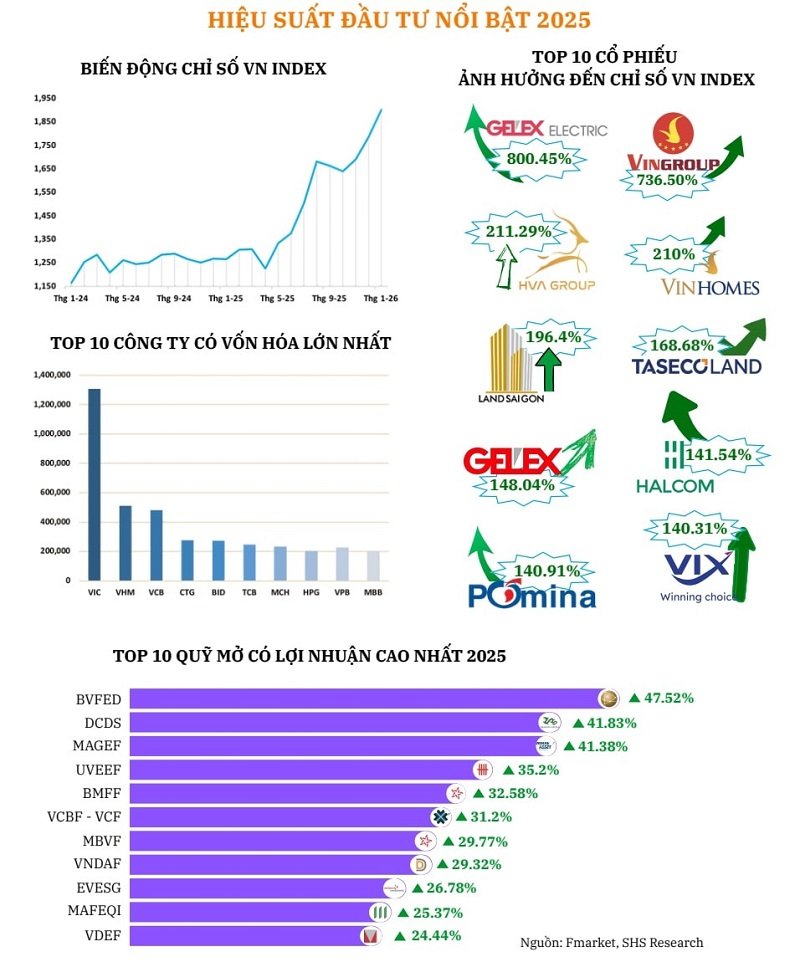 Kết thúc năm 2025, VN-Index đóng cửa tại 1.784,49 điểm, tăng 40,87% so với cuối năm 2024, sau khi thiết lập mức đỉnh 1.805,93 điểm vào ngày 25/12/2025. Trong cùng giai đoạn, VN30 tăng 51,0%, cho thấy mức độ vượt trội của nhóm cổ phiếu vốn hóa lớn so với mặt bằng chung thị trường.