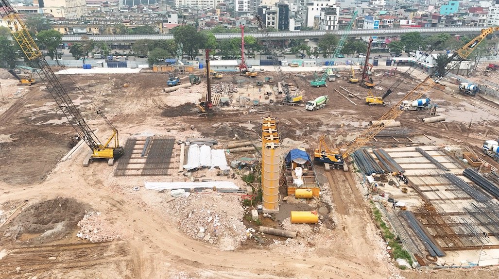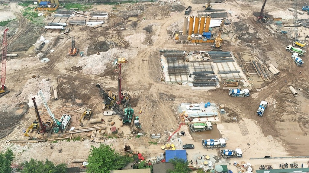 Trên công trường, các dàn máy khoan cọc nhồi hoạt động liên tục, một số vị trí đã bắt đầu thử tải móng, đồng thời triển khai đào hầm cho những khối nhà đầu tiên.