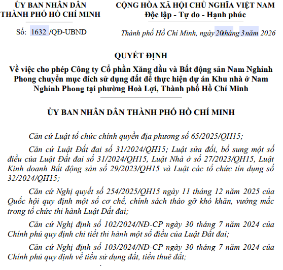 UBND TP. Hồ Chí Minh đã ban hành Quyết định số 1632/QĐ-UBND, cho phép Công ty Cổ phần Xăng dầu và Bất động sản Nam Nghinh Phong (địa chỉ: Lô D5, đường Võ Nguyên Giáp, phường Bình Dương, TP.HCM) chuyển mục đích sử dụng đất với tổng diện tích 10.338,2 m² để thực hiện dự án Khu nhà ở Nam Nghinh Phong tại phường Hòa Lợi.