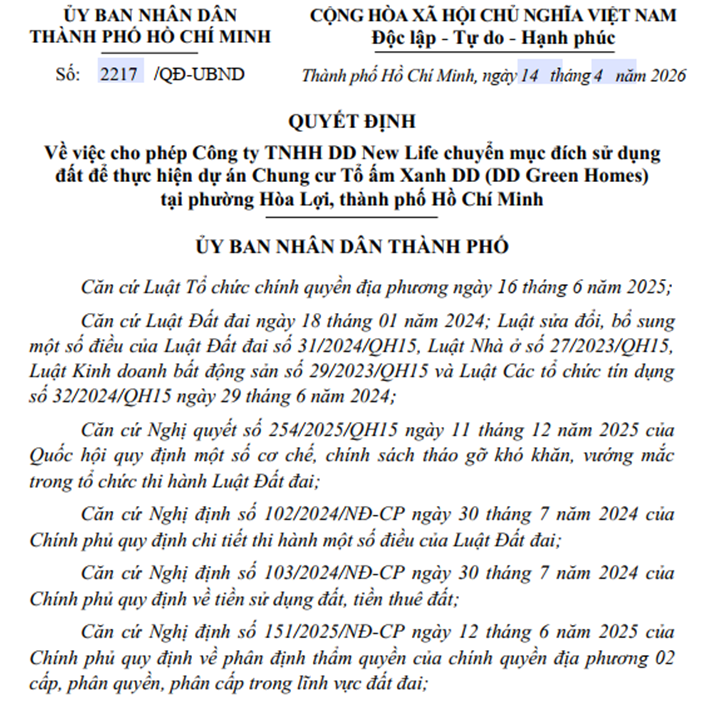 Dự án Chung cư Tổ ấm Xanh DD (DD Green Homes) không phải là “tân binh” trên thị trường bất động sản. Từ năm 2022-2023, dự án đã được đưa vào kế hoạch sử dụng đất hàng năm của thị xã Bến Cát (tỉnh Bình Dương cũ), với diện tích khoảng 1,24 ha tại các thửa đất thuộc phường Hòa Lợi. Tháng 3/2023, Sở Kế hoạch và Đầu tư tỉnh Bình Dương đã lấy ý kiến các sở, ngành về hồ sơ chấp thuận chủ trương đầu tư. Lúc bấy giờ, dự án được quy hoạch quy mô khoảng 1.437 căn hộ, gồm 2 block cao 29 tầng, tổng vốn đầu tư hơn 2.078 tỷ đồng.