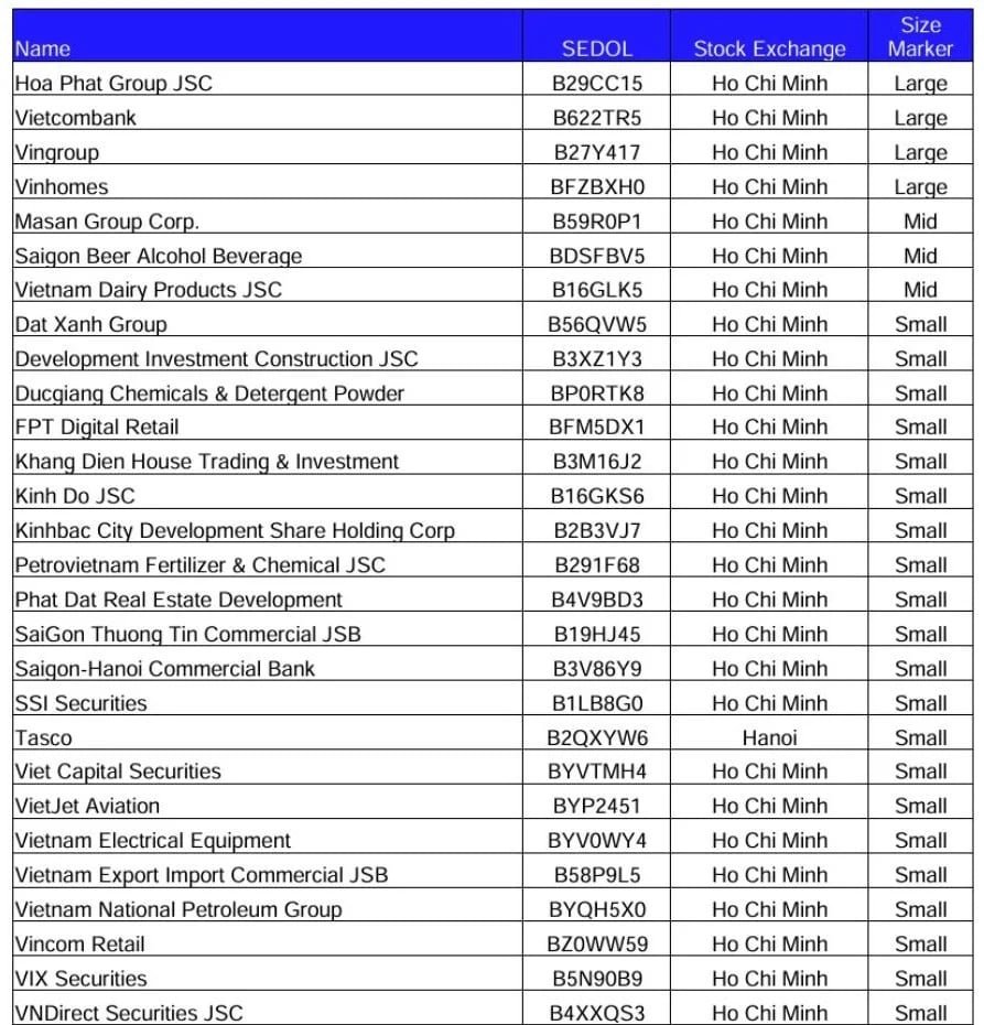 Danh sách 28 cổ phiếu có khả năng được đưa vào rổ FTSE. Nguồn: FTSE.