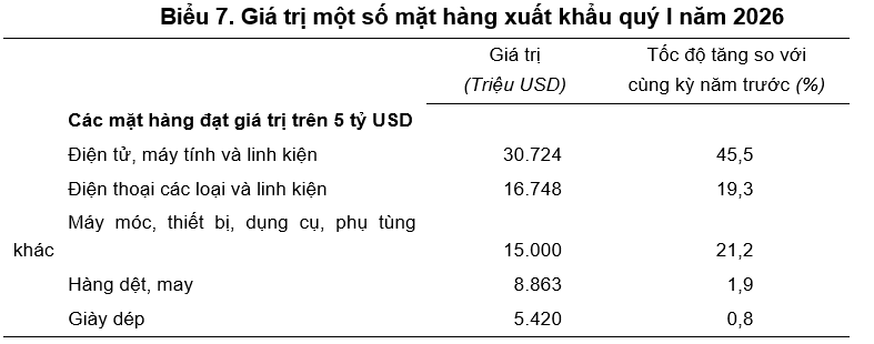 Trong quý I/2026 có 20 mặt hàng đạt kim ngạch xuất khẩu trên 1 tỷ USD, chiếm 86,8% tổng kim ngạch xuất khẩu (có 5 mặt hàng xuất khẩu trên 5 tỷ USD, chiếm 62,4%).