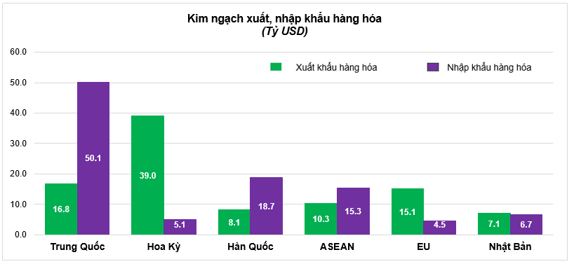 Trong quý I/2026, xuất siêu sang Hoa Kỳ đạt 33,9 tỷ USD tăng 24,2% so với cùng kỳ năm trước; xuất siêu sang EU 10,6 tỷ USD, tăng 6,6%; xuất siêu sang Nhật Bản 0,4 tỷ USD, giảm 28,4%; nhập siêu từ Trung Quốc 33,3 tỷ USD, tăng 34,4%; nhập siêu từ Hàn Quốc 10,6 tỷ USD, tăng 48,7%; nhập siêu từ ASEAN 5,0 tỷ USD, tăng 31,3%.
