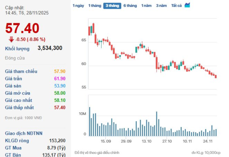 Trên thị trường chứng khoán, kết phiên 29/11, giá cổ phiếu VCB ở mức 57.400 đồng/cổ phiếu, giảm 0,86% so với phiên trước, khối lượng cổ phiếu giao dịch khớp lệnh đạt hơn 3,5 triệu đơn vị.